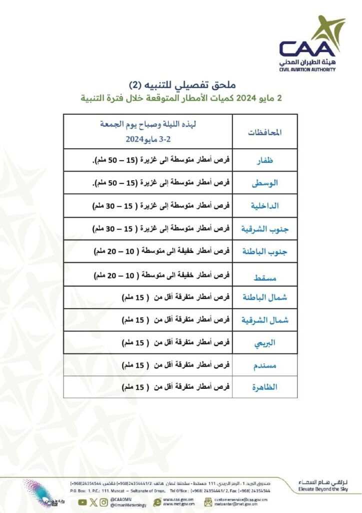 نظراً لغزارة الأمطار الرعدية والمصحوبة برياح هابطة نشطة وتساقط لحبات البرد المتوقع هطولها خلال الليلة وحتى صباح يوم غد الجمعة على محافظات ظفار والوسطى والداخلية وجنوب الشرقية مع كميات أمطار تتراوح من (15-50) ملم تؤدي لجريان الشعاب وبعض والأودية، وهطول أمطار متفرقة على محافظات مسقط وشمال الباطنة وجنوب الباطنة وشمال الشرقية .