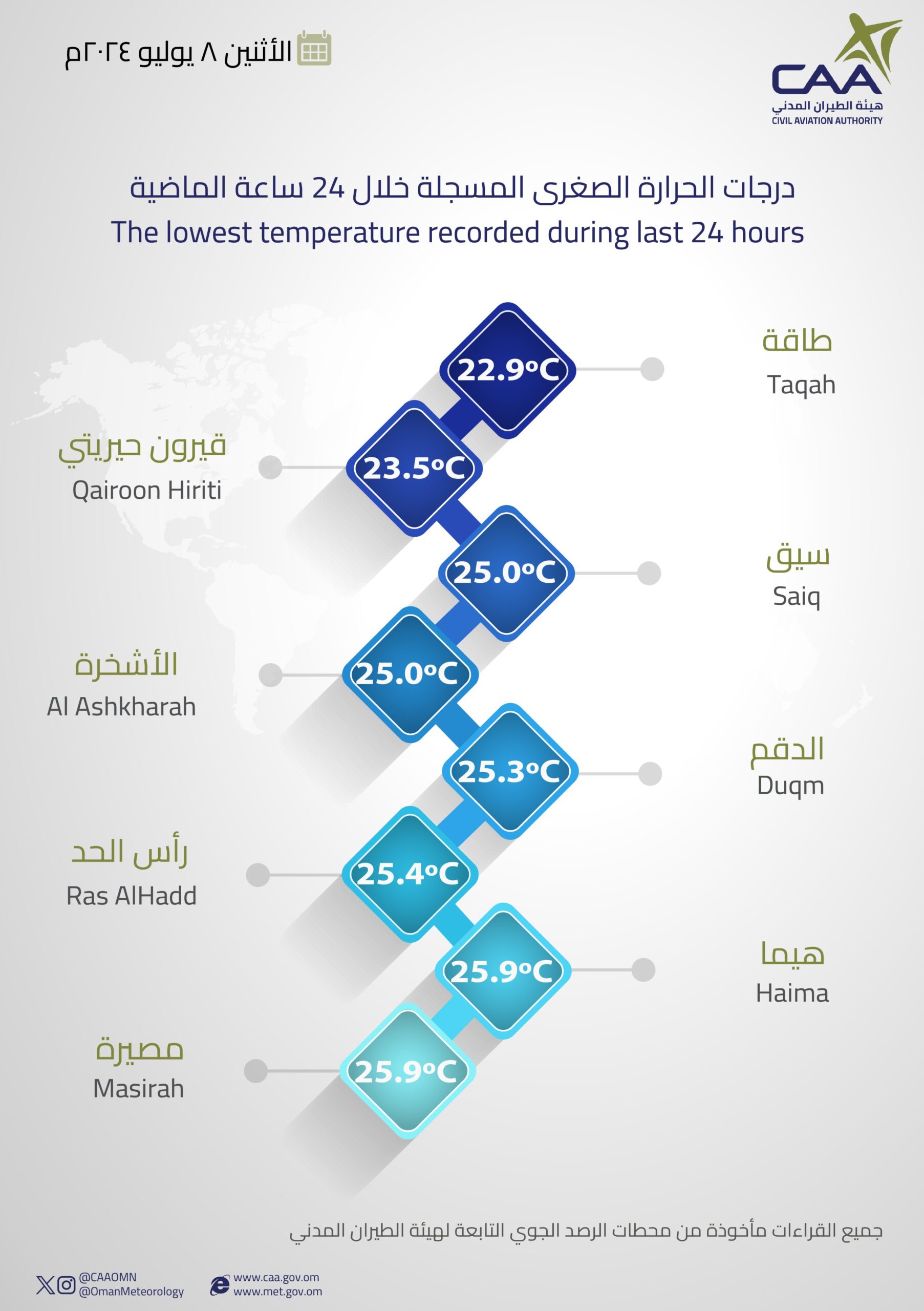 وأعلنت الأرصاد العمانية درجات الحرارة الصغرى المسجلة خلال 24 ساعة الماضية، وهي كالتالي: