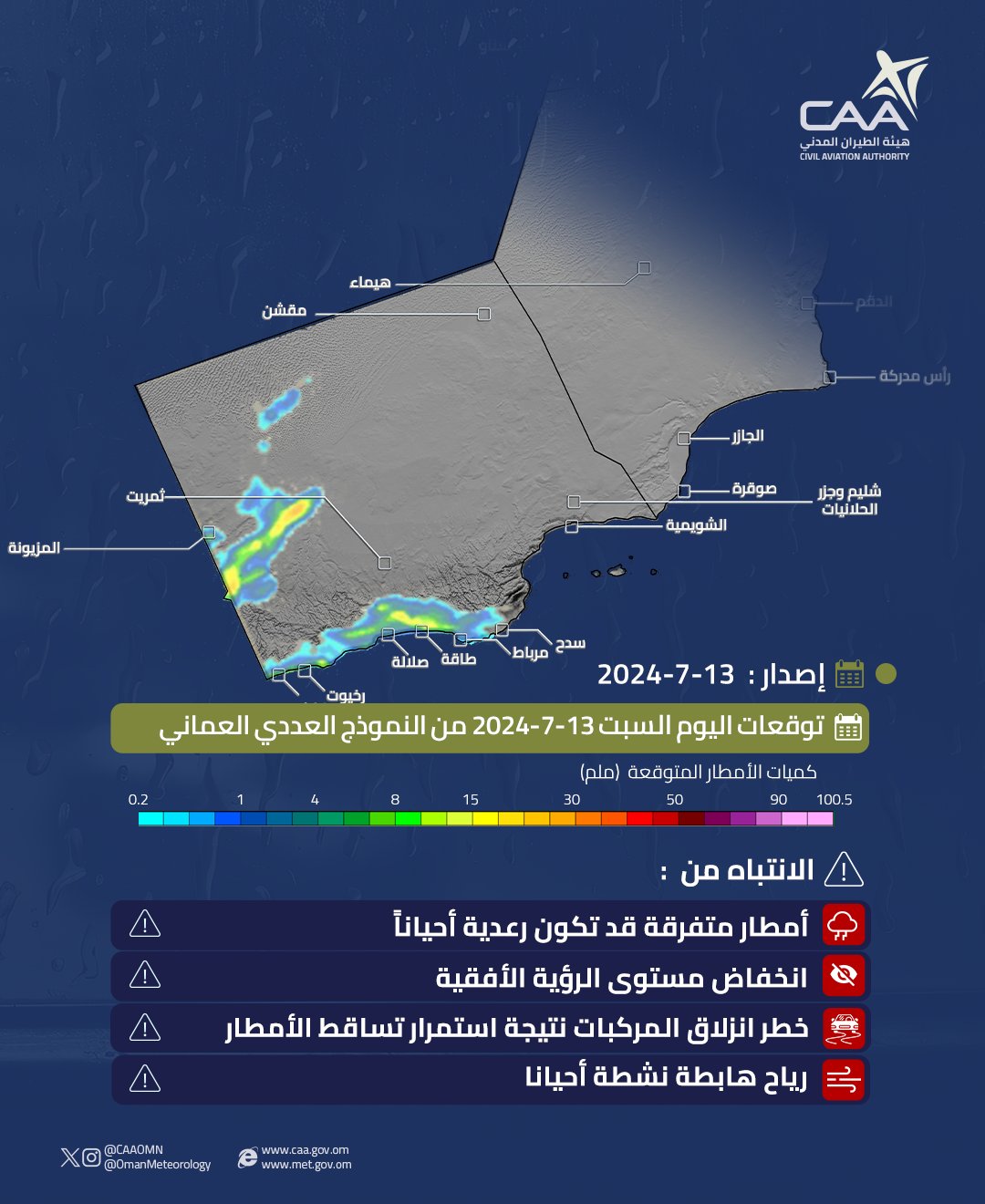 أعلنت الأرصاد العمانية استمرار فرص هطول أمطار متفرقة تكون رعدية أحيانًا، اليوم السبت، على أجزاء من جبال الحجر وعلى محافظة ظفار.