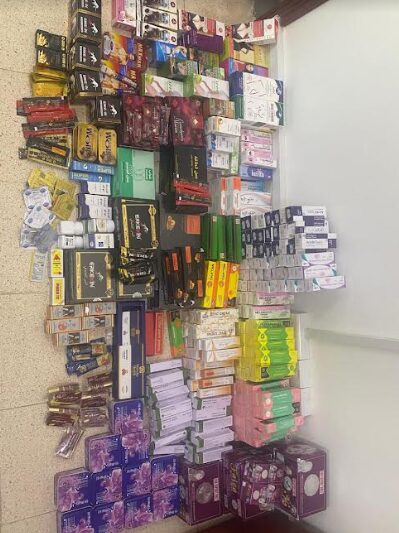 ضبطت إدارة حماية المستهلك بمحافظة جنوب الباطنة بالرستاق مؤسسة تجارية تعمل في مجال بيع الكماليات تقوم ببيع سلع محظورة وسلع مخالفة غير مرخصة وغير مطابقة للمواصفات والمقاييس بولاية المصنعة، وذلك في إطار الجهود التي تبذلها الهيئة في الحد من التجاوزات التي يقوم بها بعض الباعة والمزودين وضبط السلع المحظورة والمخالفين.