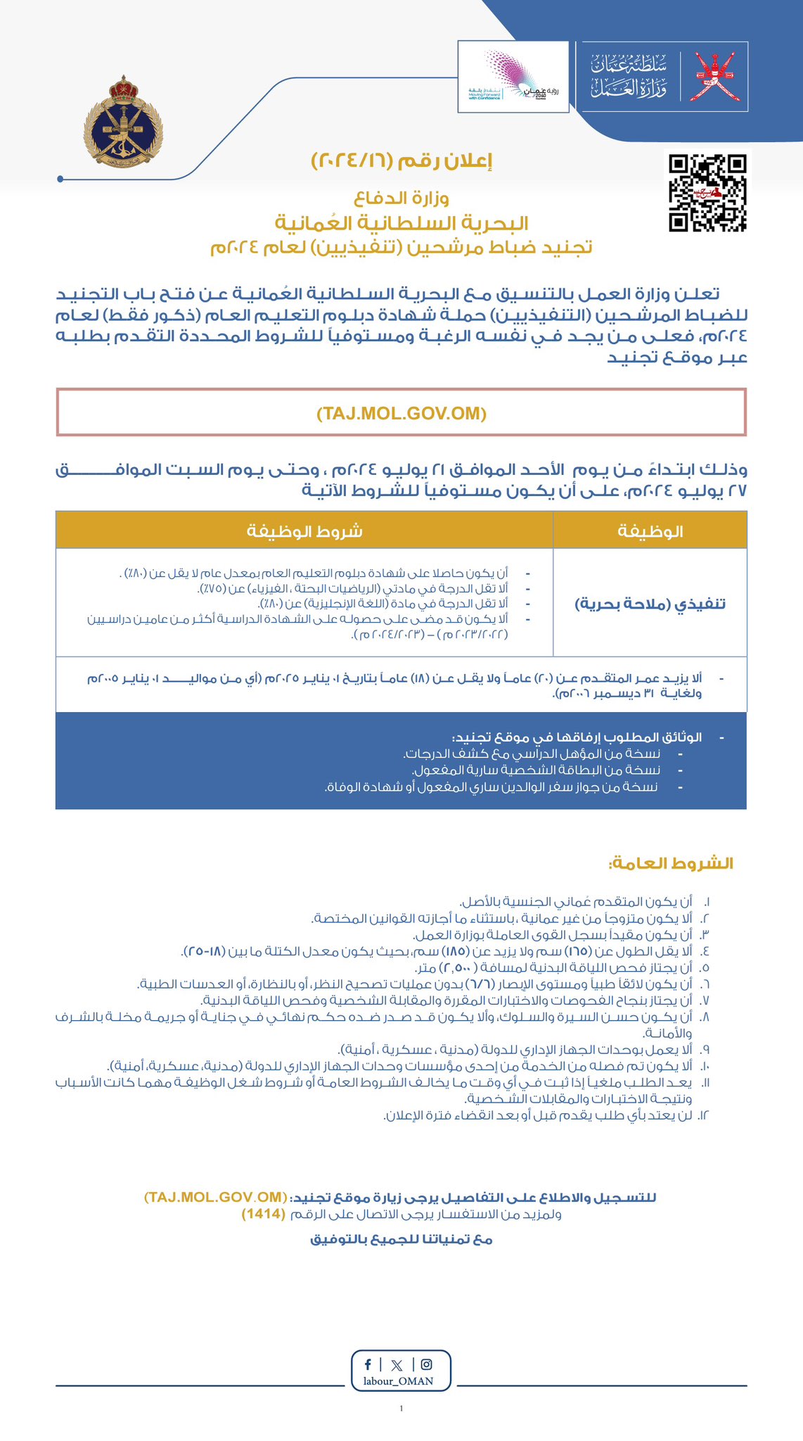 أعلنت وزارة العمل وبالتنسيق مع البحرية السلطانية العُمانية، فتح باب التجنيد للضباط المرشحين ( التنفيذيين)، وذلك ابتداءً من يوم الأحد الموافق 21 يوليو 2024م، وحتى يوم السبت الموافق 27 يوليو 2024م.
