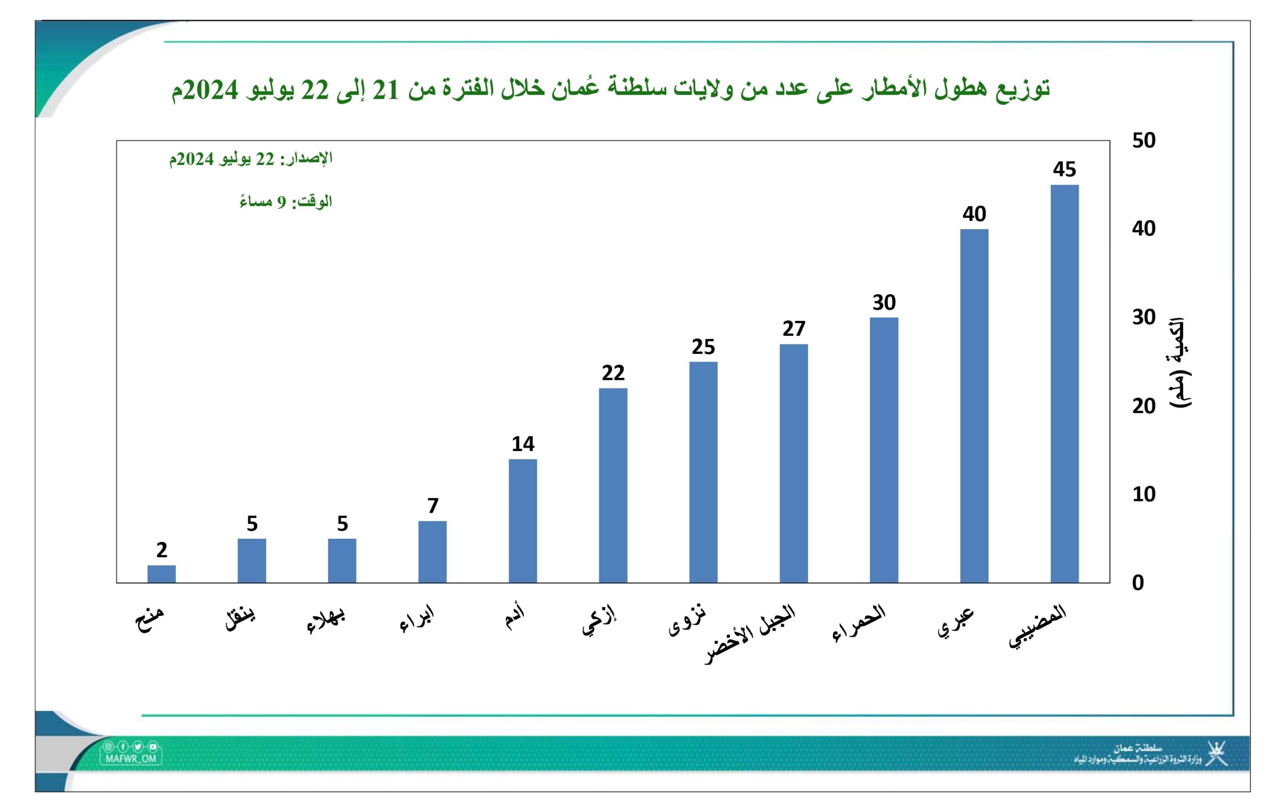 نشرت وزارة الثروة الزراعية والسمكية وموارد المياه توزيع هطول الأمطار على عدد من ولايات سلطنة عُمان خلال الفترة من 21-22 يوليو 2024م.