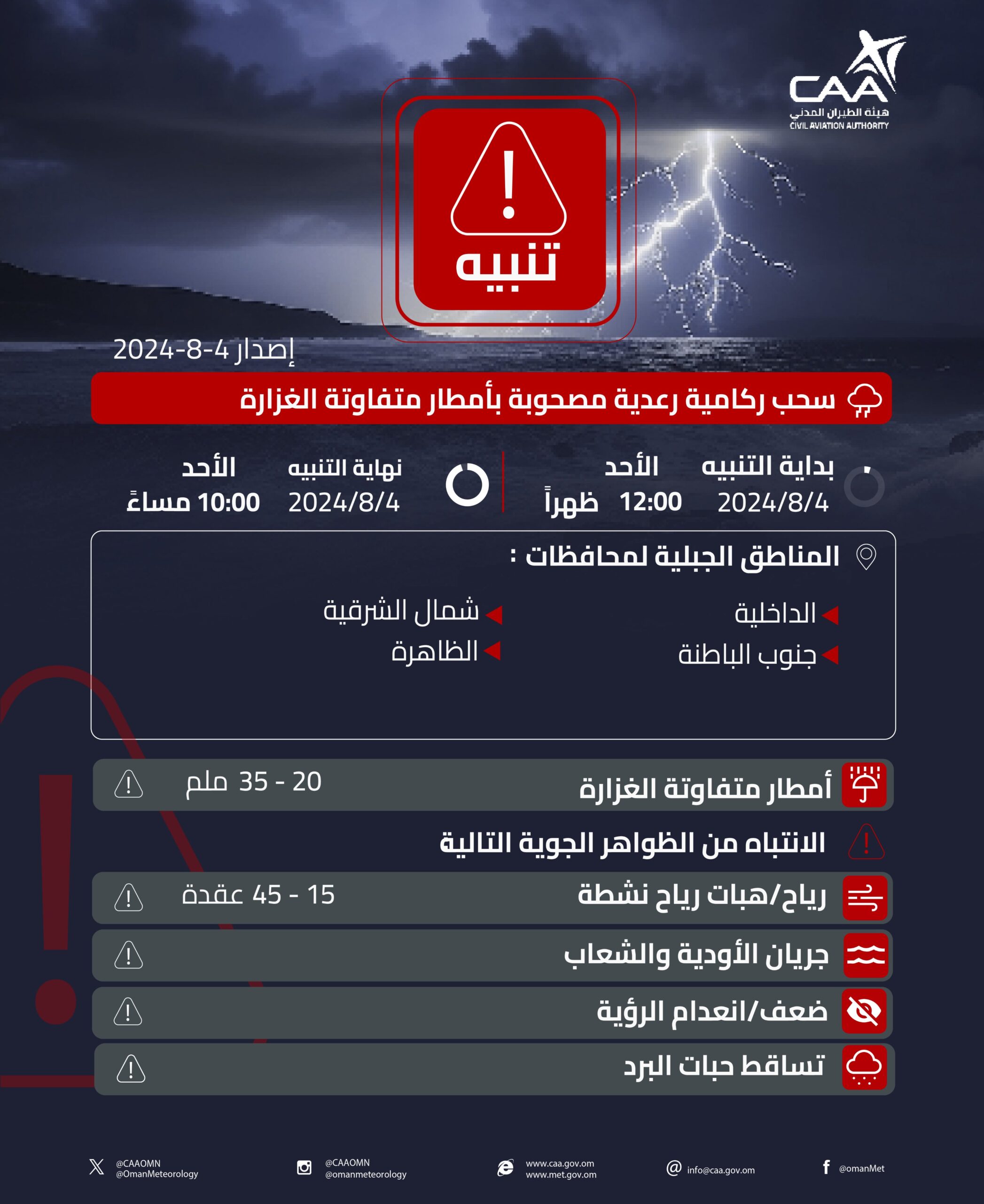 نشرت الأرصاد العمانية تنبيها بأمطار رعدية.