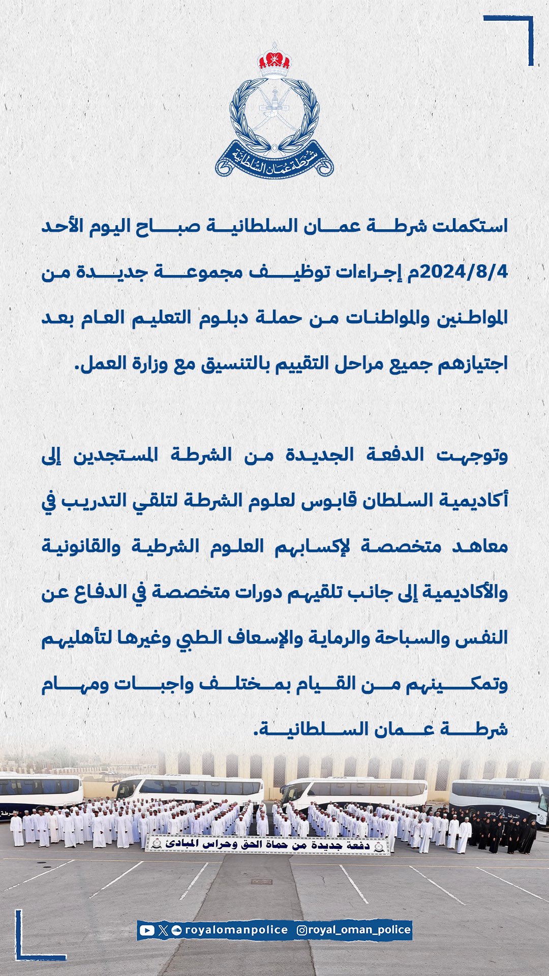 أعلنت شرطة عمان السلطانية توظيف دفعة جديدة من المواطنين والمواطنات من حملة دبلوم التعليم العام.