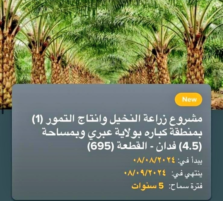 تتضمن هذه الفرص فرصة لمشروعين لزراعة القرعيات والثوم العماني في منطقة كباره بولاية عبري، حيث تصل مساحة كل مشروع إلى 4.5 فدان. كما تشمل الفرص 4 مشروعات لزراعة النخيل وإنتاج التمور في نفس المنطقة، بمساحة 4.5 فدان لكل مشروع.