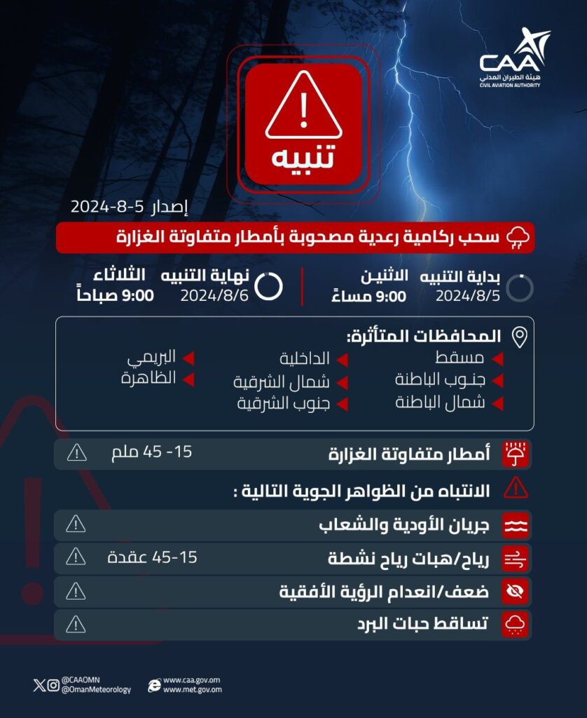 أصدرت الأرصاد الجوية تنبيها جديدا عن سحب ركامية رعدية مصحوبة بأمطار متفاوتة الغزارة ابتداءً من مساء اليوم حتى صباح الغد تتراوح بين 15 و45 ملم، على محافظات: مسقط، والداخلية، والبريمي، وجنوب الباطنة، وشمال الشرقية، والظاهرة، وشمال الباطنة، وجنوب الشرقية.