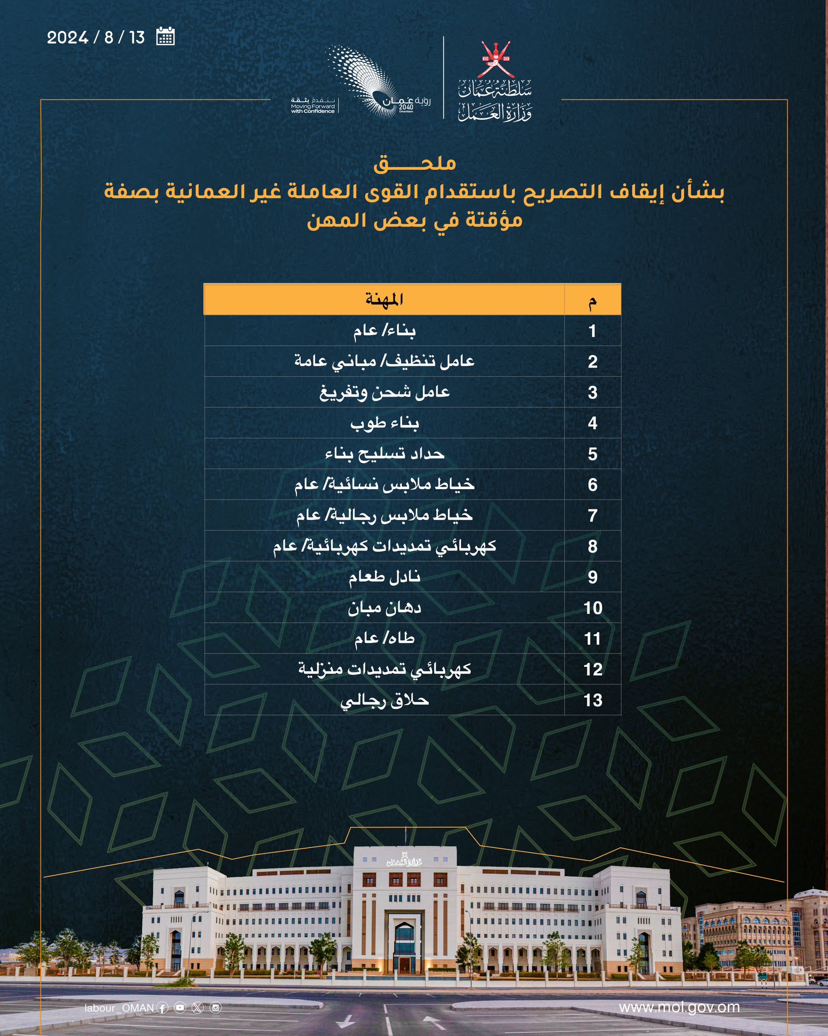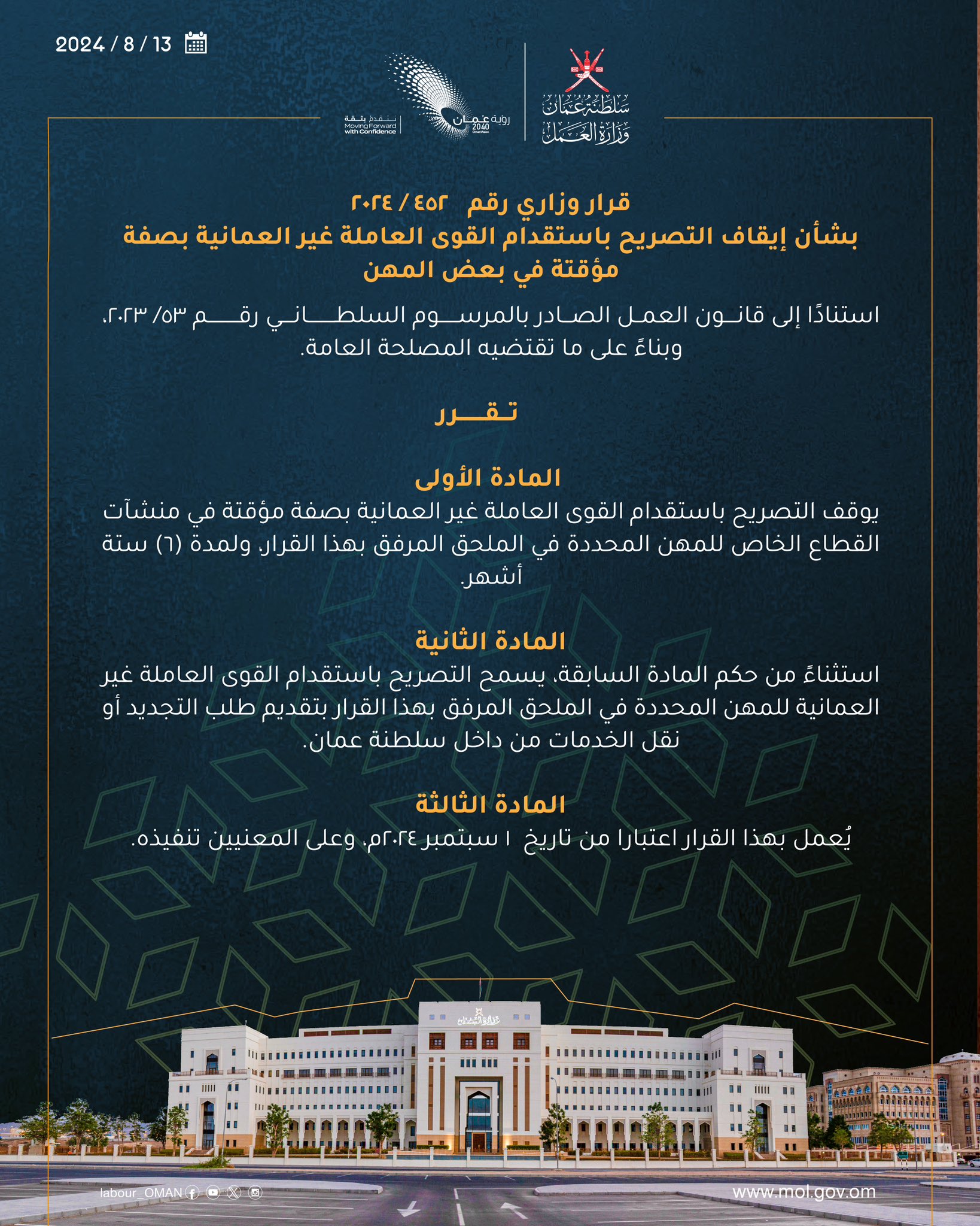 أصدرت وزارة العمل قرارًا وزارياً رقم (٢٠٢٤/٤٥٢) بشأن إيقاف التصريح باستقدام القوى العاملة غير العُمانية بصفة مؤقتة لبعض المهن لمدة(٦) ستة أشهر.