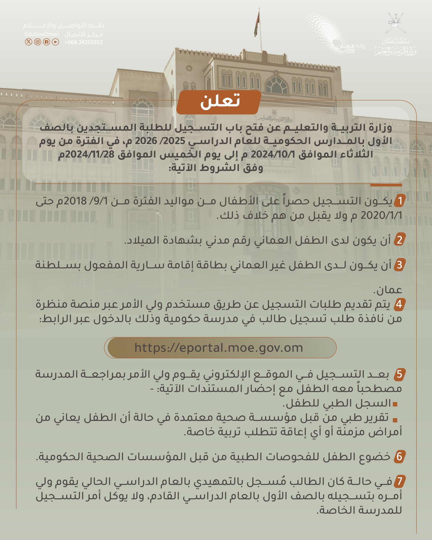 أعلنت وزارة التربية والتعليم عن فتح باب التسجيل للطلبة المستجدين بالصف الأول بالمدارس الحكومية للعام الدراسي ٢٠٢٦/٢٠٢٥م.