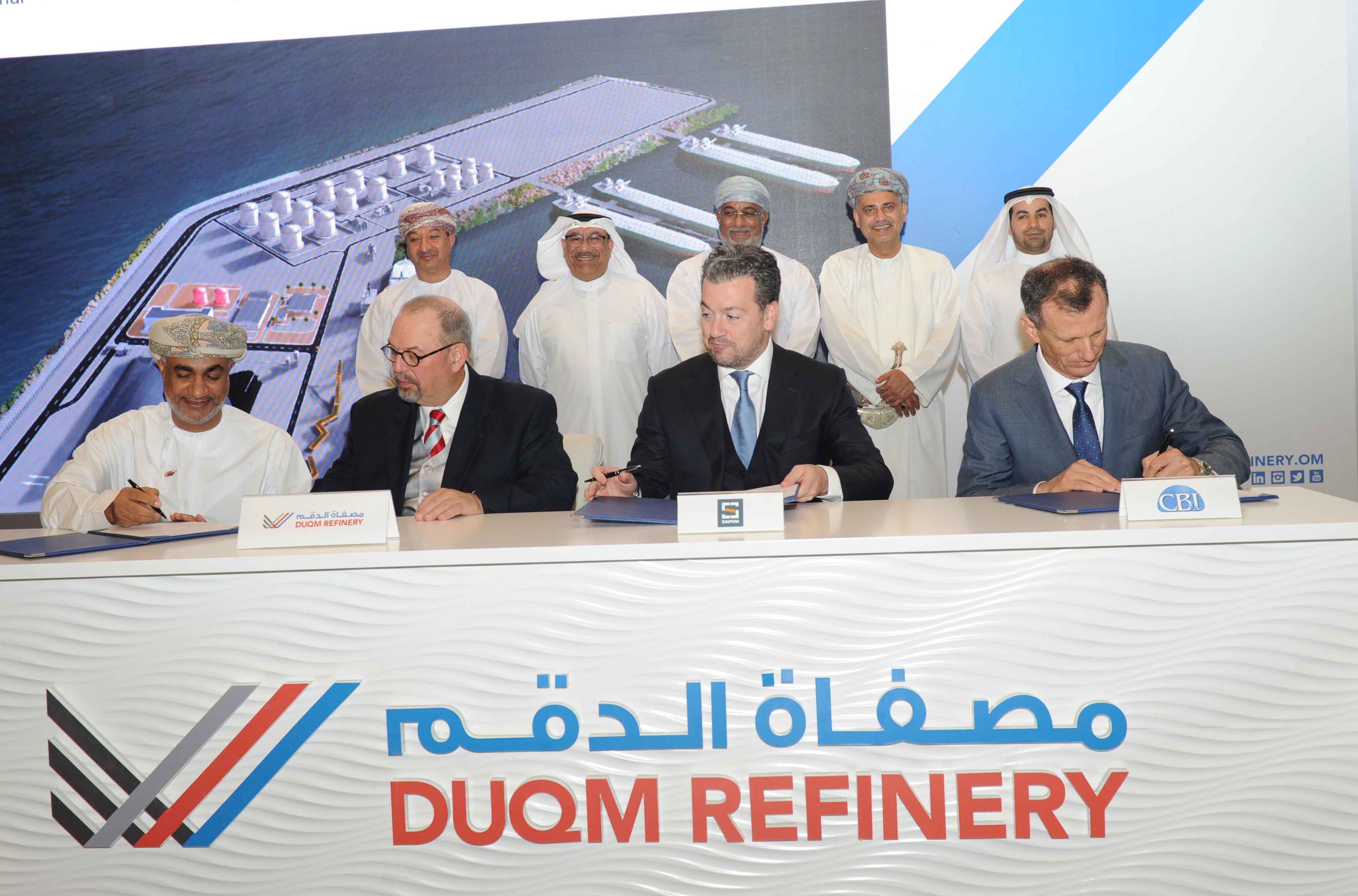 العمانية: وقعت شركة مصفاة الدقم اليوم على 3 عقود تتصل بالأعمال الهندسية والإنشائية والمشتريات للشروع في تشييد مجمع المصفاة والخدمات التابعة له بالمنطقة الاقتصادية الخاصة بالدقم والتي ستصل طاقتها التكريرية إلى 230 ألف برميل يوميًا.