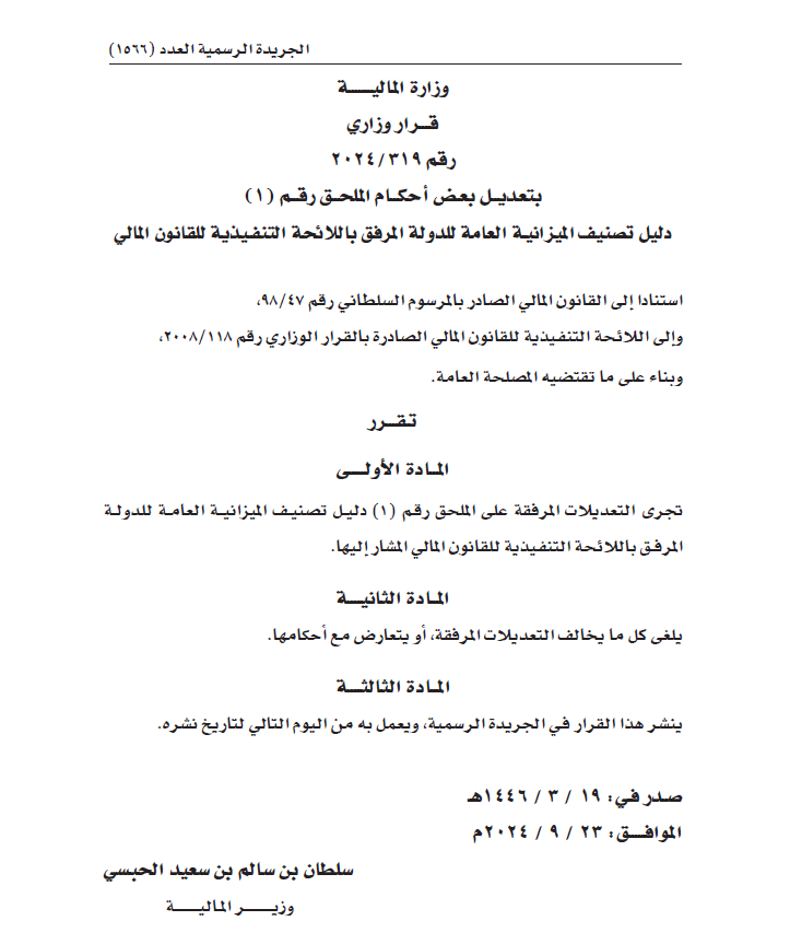 أصدرت وزارة المالية قرارا وزاريا رقم 319 لسنة 2024 بتعديل بعض أحكام الملحق رقم 1 دليل تصنيف الميزانية العامة للدولة المرفق باللائحة التنفيذية للقانون المالي.