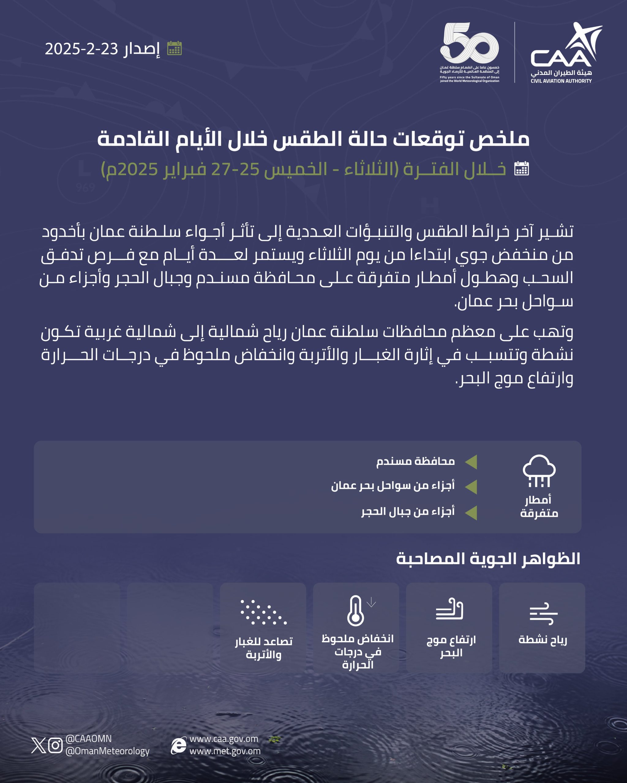 أعلنت الأرصاد العمانية تأثر الأجواء العمانية بأخدود من منخفض جوي خلال الأيام المقبلة،في الفترة من الثلاثاء إلى الخميس.