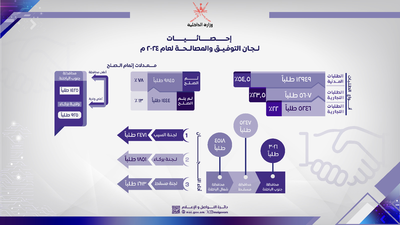 الجدير بالذكر أن وزارة الداخلية تسعى حاليًا إلى إنشاء نظام إلكتروني شامل لإجراءات لجان التوفيق والمصالحة، في خطوة تعكس التوجه نحو التحول الرقمي بما يتماشى مع الاستراتيجية الوطنية لرؤية عمان 2040.
