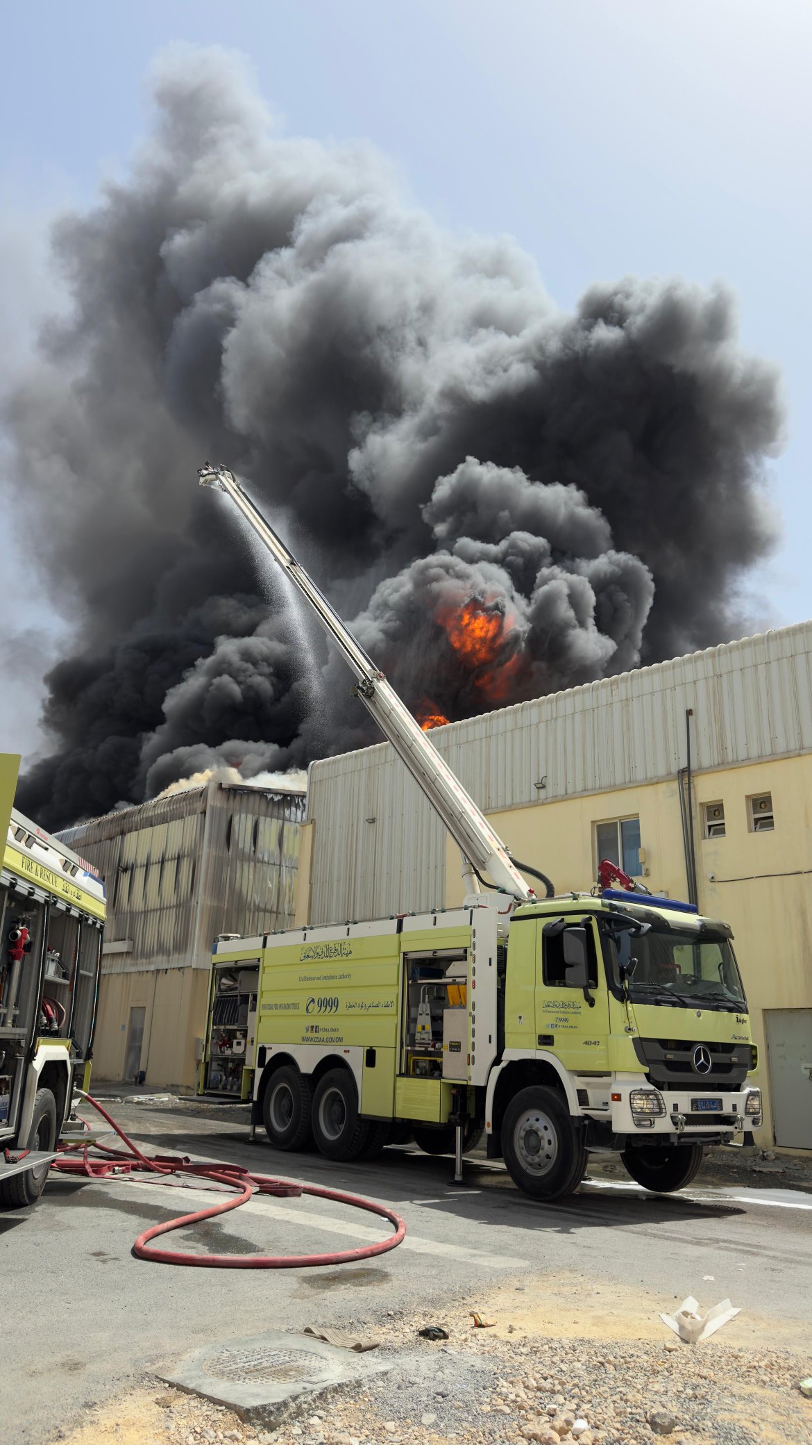 تتعامل فرق الإطفاء بإدارة الدفاع المدني والإسعاف بمحافظة مسقط مع حادث نشوب حريق في مستودعات بمنطقة الرسيل الصناعية بولاية السيب، ولا تزال عمليات الإطفاء مستمرة للسيطرة على الحريق.