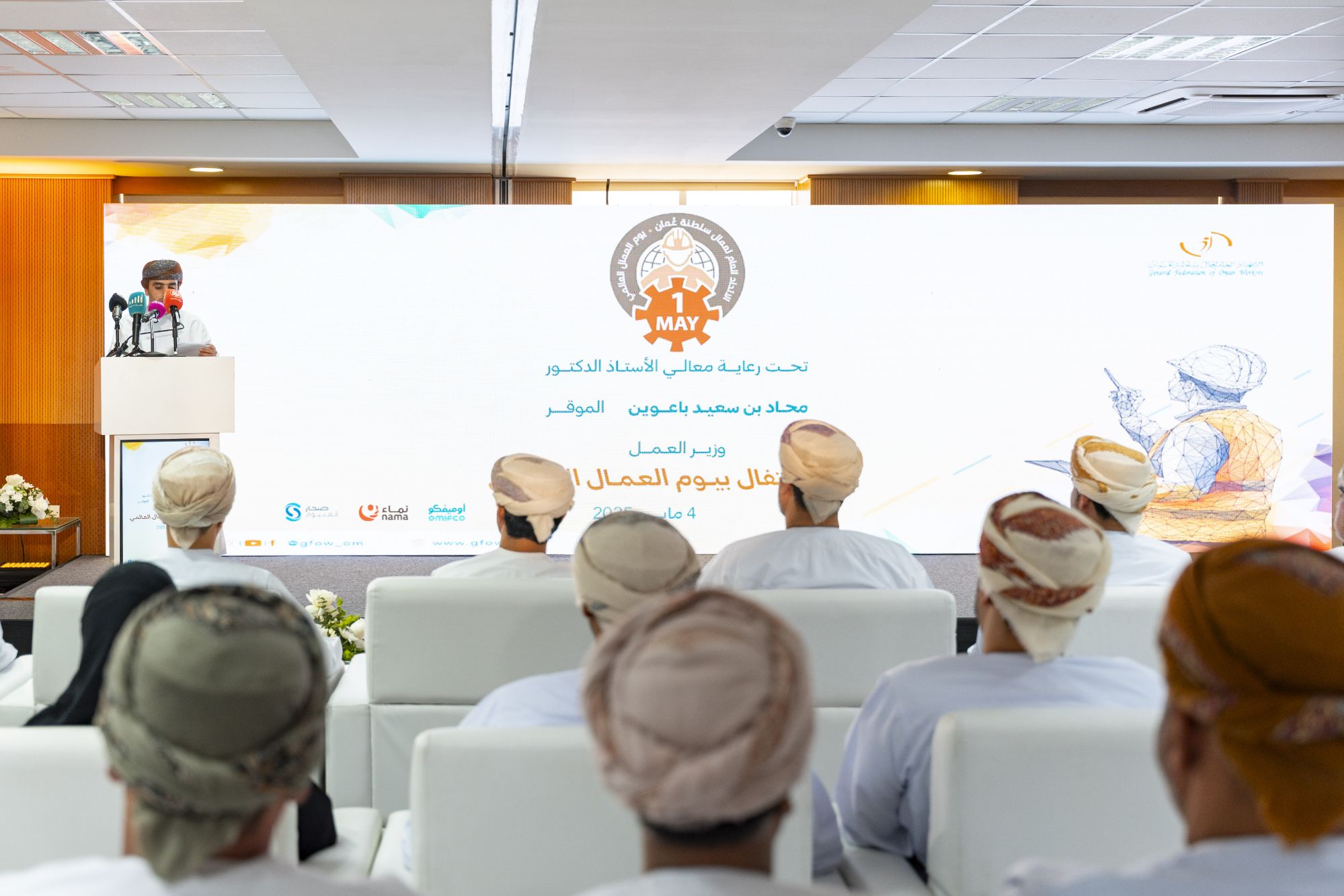 احتفل الاتحاد العام لعمال سلطنة عُمان اليوم بمناسبة يوم العمال العالمي، الذي يوافق الأول من مايوم من كل عام، تحت رعاية معالي الأستاذ الدكتور محاد بن سعيد باعوين، وزير العمل، وبحضور عدد من أصحاب السعادة، وممثلي بعض مؤسسات القطاع الخاص، وممثلي بعض مؤسسات المجتمع المدني ومؤسسات القطاع الخاص، ومجموعة من الإعلاميين المهتمين بقضايا العمل والعمال.