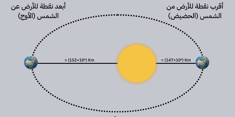 وأشار المحروقي إلى أن مصطلح “الأوج” (Aphelion) يُطلق على النقطة التي تكون فيها الأرض في أقصى بُعدها عن الشمس، فيما يُطلق على أقرب نقطة “الحضيض” (Perihelion)، والتي ستحدث في 3 يناير 2026م، عندما تقترب الأرض من الشمس إلى مسافة تُقدّر بـحوالي 147,099,894 كيلومترًا.