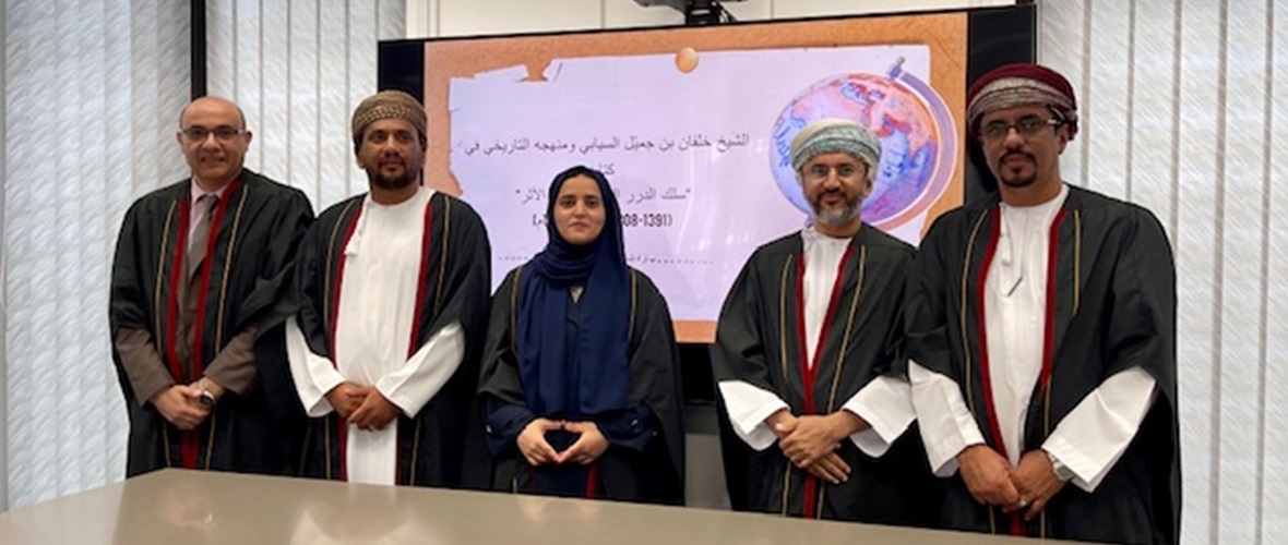 ناقش قسم التاريخ بكلية الآداب والعلوم الاجتماعية بجامعة السلطان قابوس رسالة ماجستير للطالبة سارة بنت ناصر الجعفرية بعنوان (الشيخ خلفان بن جميّل السيابي ومنهجه التاريخي في كتابه “سلك الدرر الحاوي غرر الأثر”(1308-1391هـ/1891-1972م)).
