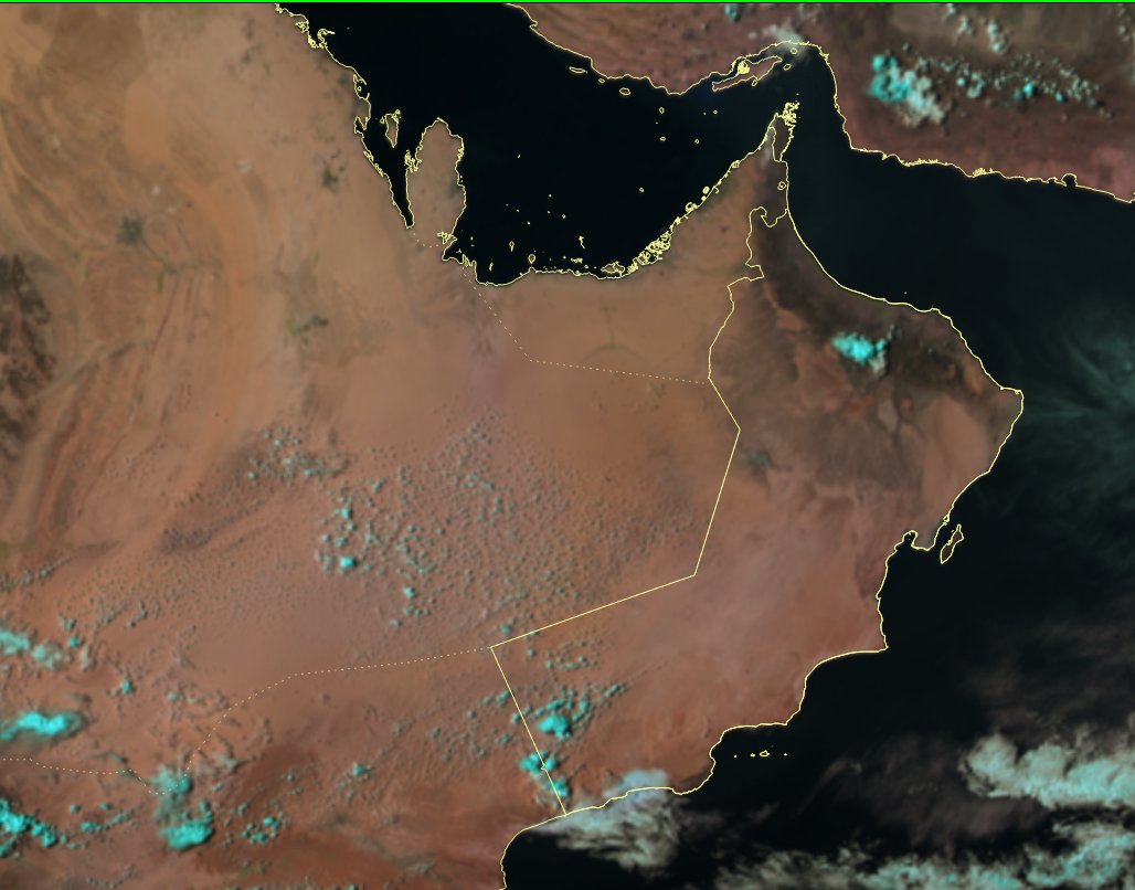 قالت الأرصاد العمانية إن الصورة الجوية تظهر استمرار نشاط السحب الركامية وأمطار متفاوتة الغزارة -مصحوبة برياح نشطة أحيانًا- على جبال الحجر الشرقي والمناطق المجاورة.