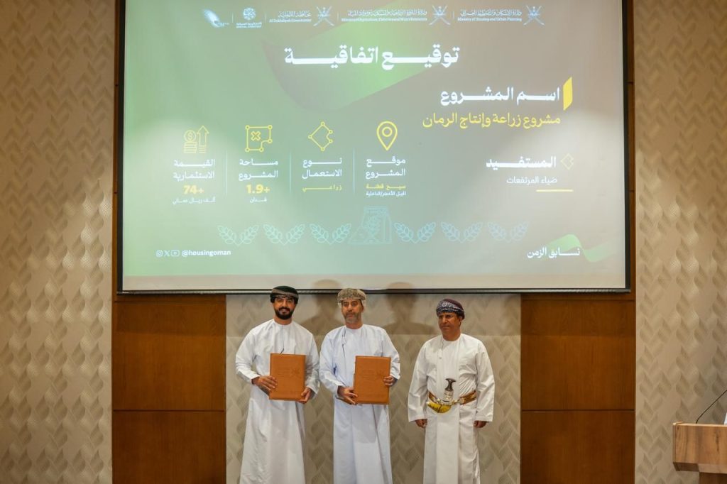 في إطار تعزيز الاقتصاد ودعم الأمن الغذائي، وقّعت وزارة الإسكان والتخطيط العمراني بالتعاون مع وزارة الثروة الزراعية والسمكية وموارد المياه 13 عقد انتفاع زراعي لمشاريع استثمارية في محافظتي الداخلية وجنوب الباطنة، بقيمة استثمارية تجاوزت 2.7 مليون ريال عماني وعلى مساحة إجمالية تجاوزت 246 فدان.