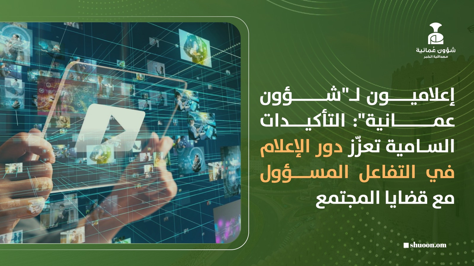 وأضافوا -في تصريحات لـ”شؤون عمانية” أن جلالته أكد على أهمية التفاعل مع قضايا المجتمع والتحديات القائمة، وإيصال الرسائل الصحيحة المناسبة بشأن القضايا المطروحة في وسائل الإعلام ومنصات التواصل الاجتماعي، وتوضيح الجهود المبذولة وما تحقق من منجزات ومكتسبات على المستوى الوطني ورفع مستوى الوعي المجتمعي، وهو ما يجسد الحرص السامي على تعزيز دور الإعلام الوطني في مواكبة قضايا المجتمع.