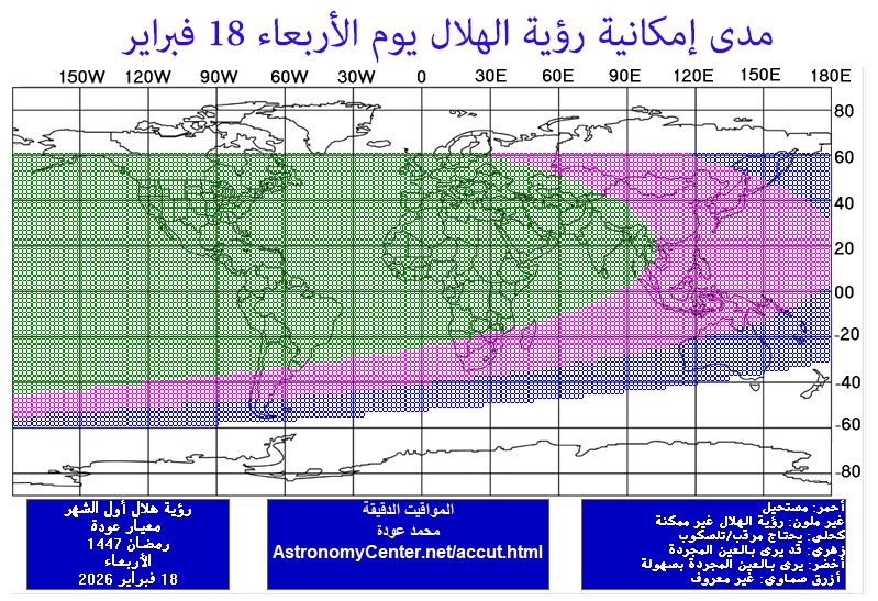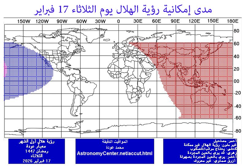 وذكر المركز في بيان: “ستتحرى معظم الدول هلال شهر رمضان يوم الثلاثاء 17 فبراير 2026م، فإن رؤية الهلال يوم الثلاثاء هي ما بين مستحيلة أو غير ممكنة من جميع مناطق العالم العربي والإسلامي سواء بالعين المجردة أو باستخدام التلسكوب أو حتى باستخدام تقنية التصوير الفلكي فائقة القوة، وبناء على ذلك وبالنسبة للدول التي تعتبر رؤية الهلال الصحيحة شرطا لبدء الشهر الهجري، فمن المتوقع أن يكون يوم الأربعاء هو المتمم لشهر شعبان، ويوم الخميس 19 فبراير هو أول أيام شهر رمضان المبارك.