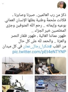 ومن جانب أخر أشار المغرد “محمود الرقيشي” إلى أن عُمان ولادة بالقادة الذين يديرون دفتها بكل اقتدار وحكمة، وقال: (ما لفت انتباهي في هذه الملحمة هو شبه غياب أصحاب المعالي وقادة الأسلحة عن إدارة العمليات؛ إلا فيما ندر وهذا مبعث اطمئنان كبير أن عُمان ولاّدة بالقيادات والكوادر العظيمة في مجابهة المِحن، مهما اختلفت الأسماء والرُتب، بوركَ من صنع هؤلاء الرجال #شكراً_رجال_عُمان).