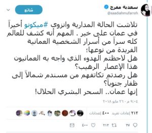 -العُماني ثابتا وصامدا ومتواضعًا: وغردت الكاتبة الكويتية “سعيدة مفرح-@saadiahmufrreh” قائلة: (بهذه الشخصية التي عركتها الطبيعة بكل قسوتها وتقلباتها بقي العُماني ثابتا وصامدا ومتواضعا، يعرف من حوله وما حوله جيدا، ويعرف أن الزبد يذهب جفاء ويبقى ما ينفع الناس، حتى لو كان هذا الزبد كالذي جاء به اعصار مكيونو لشواطئ صلالة الجميلة).واضافت: (تلاشت الحالة المدارية وانزوى ميكونو أخيرا في عُمان على خير، المهم انه كشف للعالم كله سرا من أسرار الشخصية العُمانية الفريدة من نوعها، هل لاحظتم الهدوء الذي واجه به العمانيون هذا الإعصار الرهيب؟، هل رصدتم تكاتفهم من مسندم شمالا إلى ظفار جنوبا، إنها عُمان السحر البشري الحلال).