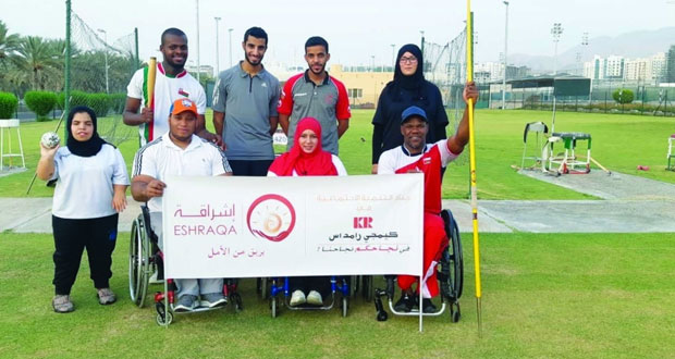 وتضم بعثة المنتخب الوطني لذوي الإعاقة 8 لاعبين يشاركون في عدد من رياضات ألعاب القوى لفئة المعوقين حيث سيشارك بطلنا محمد المشايخي وزميله محمد القاسمي في ثلاث مسابقات تشمل رمي الصولجان ورمي القرص ودفع الجلة، ويشارك فوزي الحبيشي في ثلاث مسابقات هي رمي القرص ورمي الرمح ودفع الجلة، وتشارك راية العبرية في مسابقات رمي القرص ودفع الجلة ورمي الرمح، ويشارك طالب البلوشي في مسابقتي رمي القرص ودفع الجلة، وتشارك سارة العنبورية في منافسات دفع الجلة، وفي منافسات الجري يشارك طه الحراصي في منافسات 100 مترعدوا و200 مترعدوا، ويشارك قصي الرواحي في منافسات 100 متر عدوا و200 متر عدوا وفي الوثب الطويل.