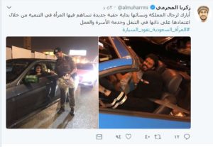 كما غردت الناشطة “أبرار بن أحمد الراشدية” قائلة: (كل التبريكات للسعوديات في هذا اليوم التاريخي ). وغرد “إبراهيم زهران” قائلا: ( المجد كل المجد لحرية المرأة، هنيئا لك يا ملكات السعودية”. وفي 6 محرم 1439 هـ الموافق 26 سبتمبر 2017م أصدر الملك سلمان بن عبدالعزيز ملك المملكة العربية السعودية، بيانًا بالسماح للمرأة السعودية بقيادة السيارة، وفقا للضوابط الشرعية على أن يكون التنفيذ ابتداءً من يوم 10 شوال 1439 هـ الموافق 26 يونيو/حزيران 2018م.