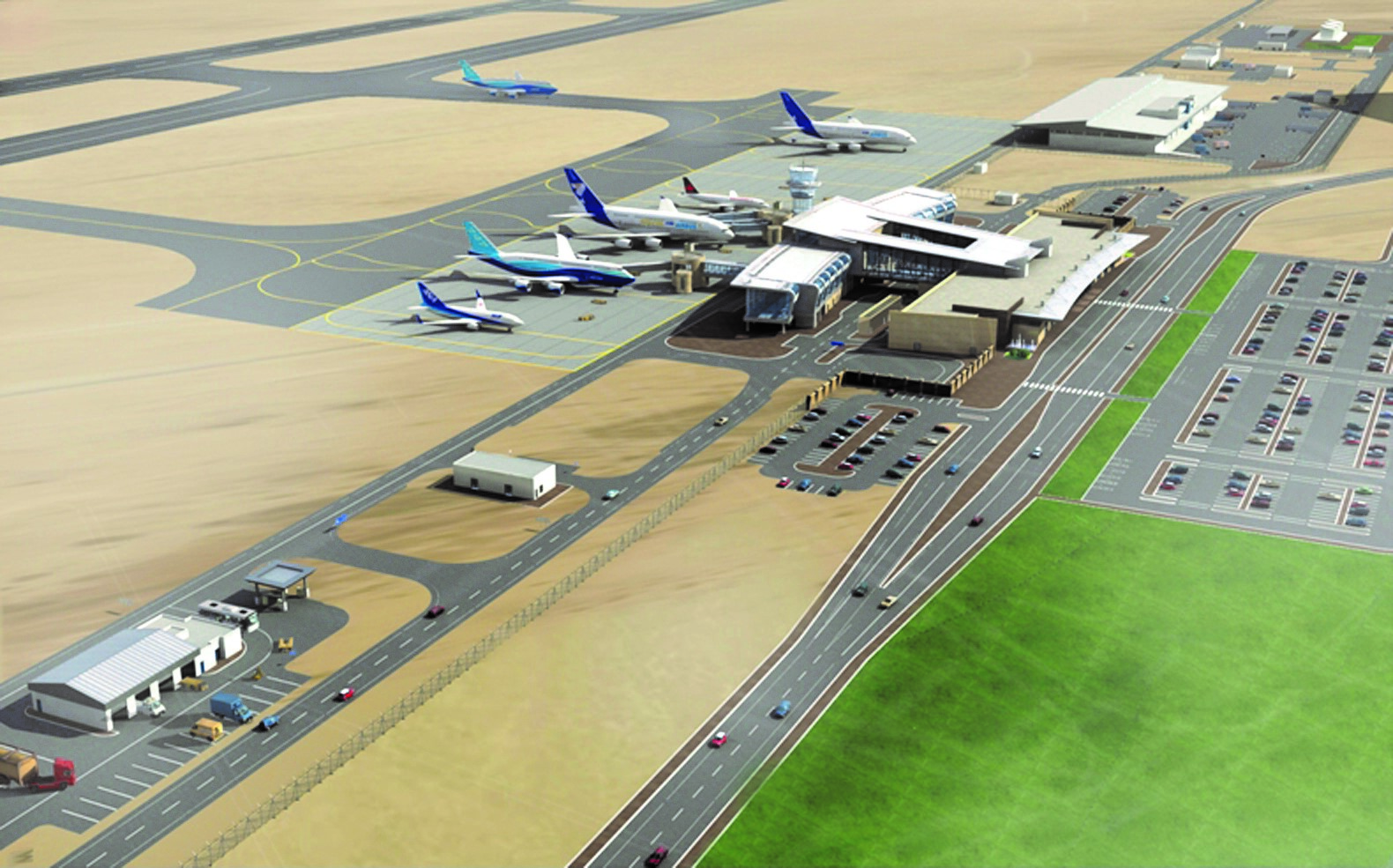 وتبلغ مساحة مبنى المسافرين في المطار 5600 متر مربع، ويتكون المطار من (2 ) من الجسور الموصلة للطائرات (خراطيم)، و (5) مناضد لتخليص إجراءات السفر، ويبلغ طول المدرج (4) كيلو مترات وبعرض (75) مترا وبإمكانه استقبال أكبر الطائرات في العالم، ويحتوي كذلك على برج للمراقبة الجوية بارتفاع وقدره (37) مترا ويتكون من 8 طوابق به مكاتب للمراقبين الجويين، كما أن مبنى المسافرين الجديد مزود بـ 8 أجهزة فحص حقائب و5 كبائن لتأجير السيارات وحجوزات الفنادق ومكاتب شركات الطيران وقاعة لكبار الشخصيات.