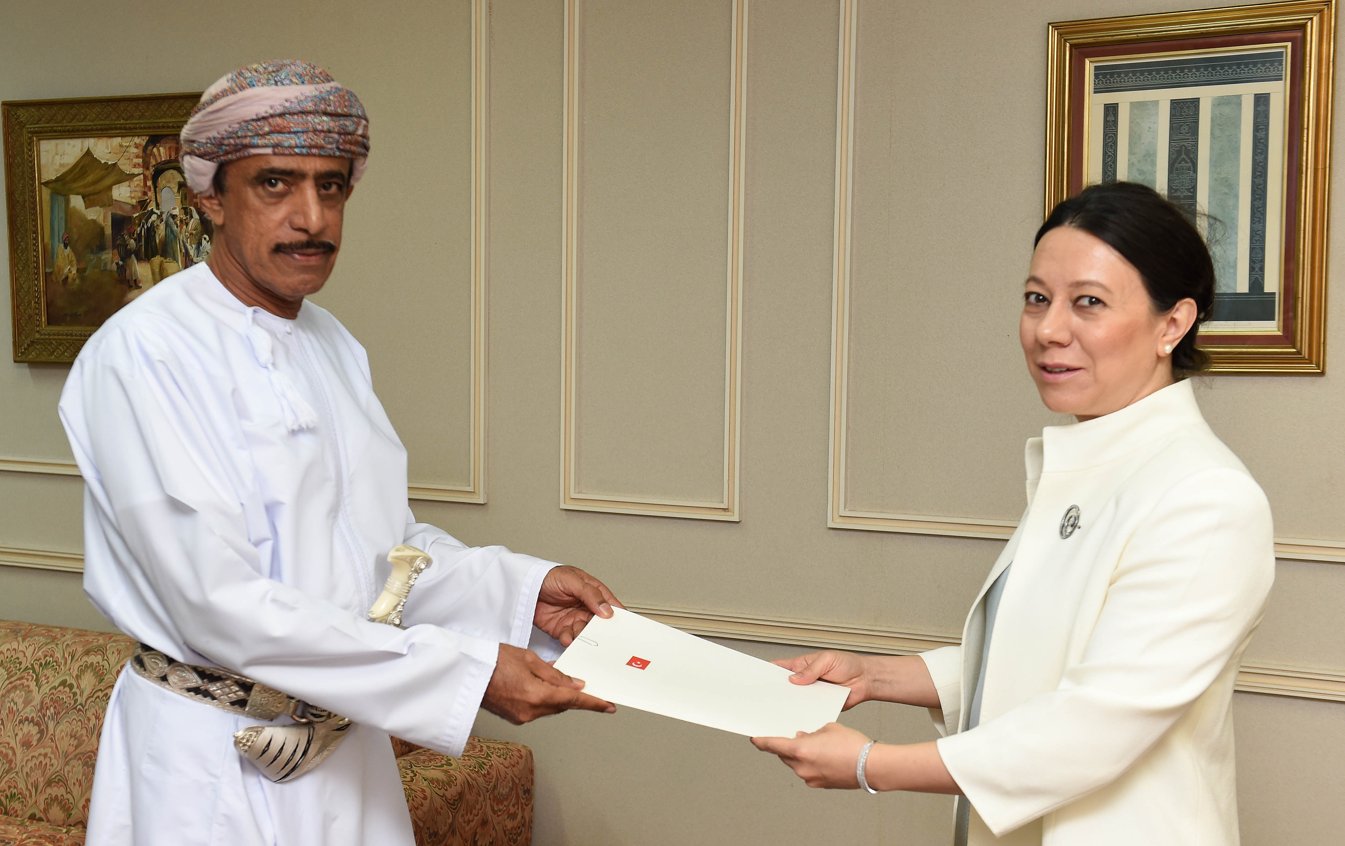 تسلم سعادة محمد بن يوسف الزرافي وكيل وزارة الخارجية للشؤون الإدارية والمالية اليوم نسخة من أوراق اعتماد سعادة السفيرة عائشة سوزين أوسلونر سفيرة جمهورية تركيا المعينة لتكون سفيرة مفوضة فوق العادة معتمدة لدى السلطنة.