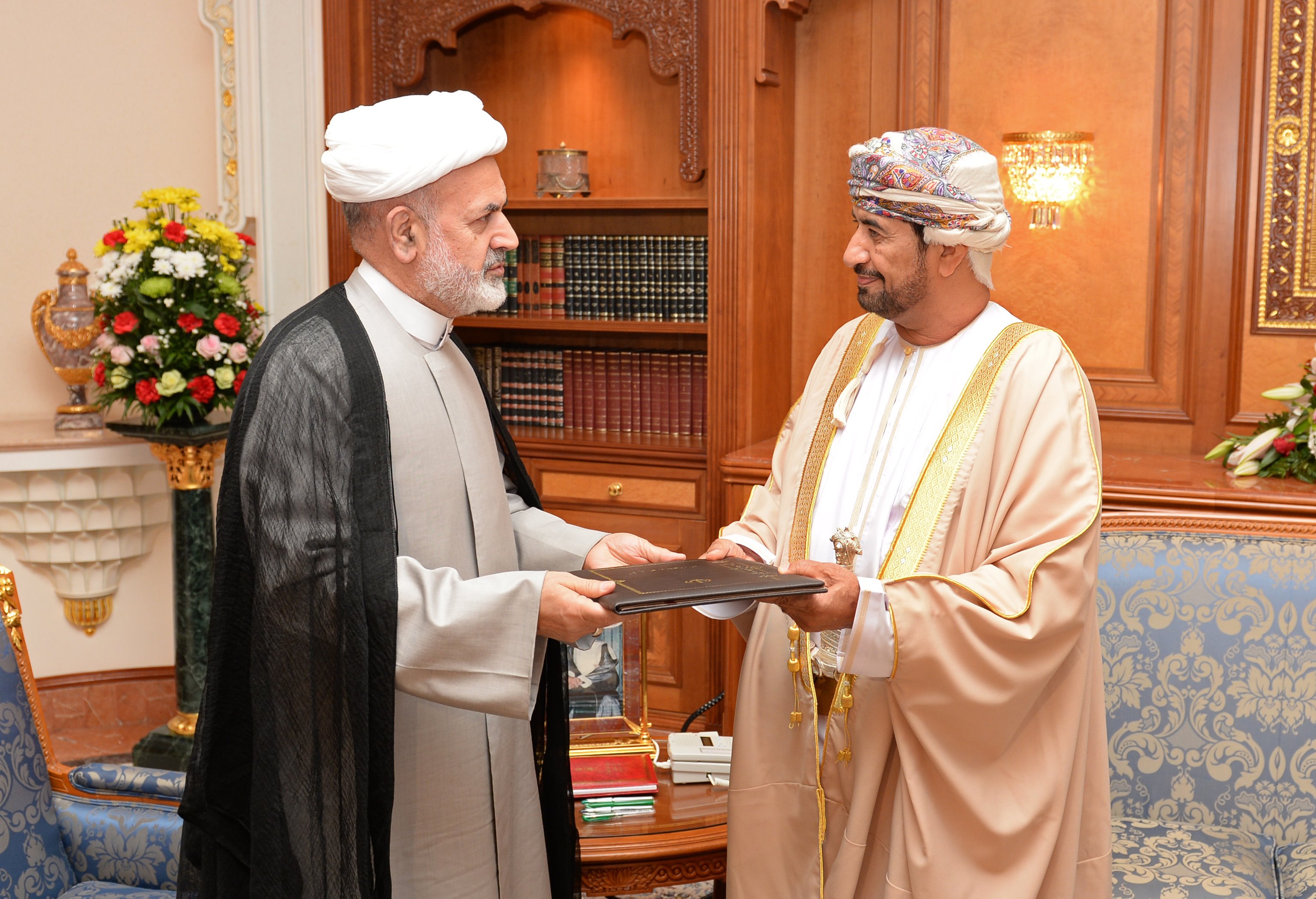 تسلّم الرسالة معالي السيد خالد بن هلال بن سعود البوسعيدي وزير ديوان البلاط السلطاني، خلال استقبال معاليه بمكتبه صباح اليوم سعادة السفير محمد رضا نوري سفير الجمهورية الإسلامية الإيرانية لدى السلطنة.