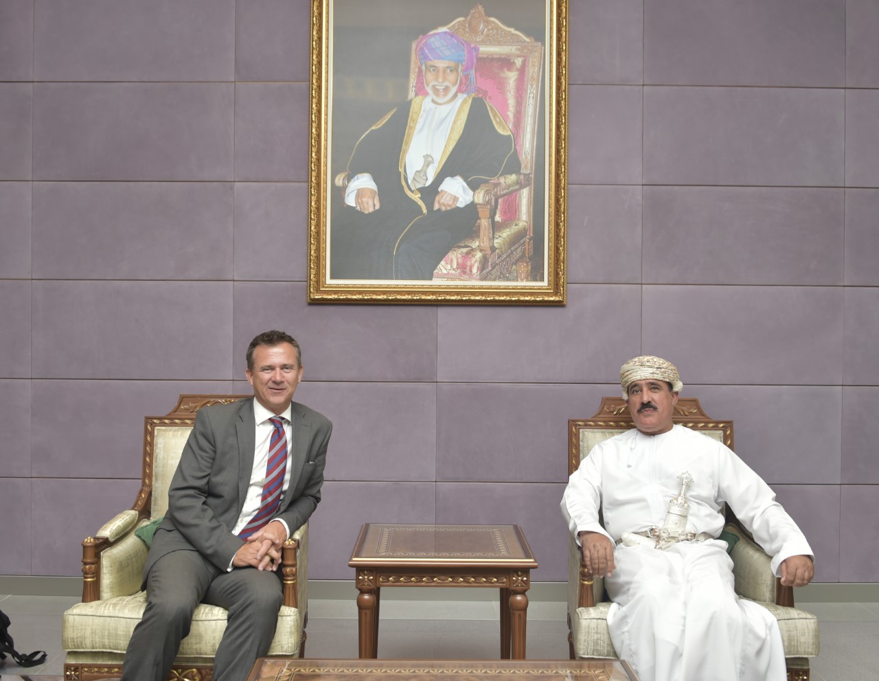 وكان في استقبال معالي وزير القوات المسلحة بالمملكة المتحدة لدى وصوله مطار مسقط الدولي العميد الركن صالح بن أحمد الهنائي رئيس المراسم العسكرية والعلاقات العامة برئاسة أركان قوات السلطان المسلحة، وملحق الدفاع البريطاني لسفارة المملكة المتحدة بمسقط.