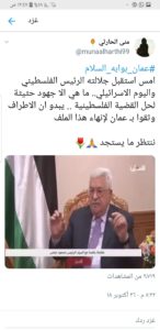 حيث غردت منى الحارثي قائلة: أمس استقبل جلالته الرئيس الفلسطيني واليوم الاسرائيلي.. ما هي إلا جهود حثيثة لحل القضية الفلسطينية .. يبدو ان الاطراف وثقوا ب عمان لإنهاء هذا الملف.. ننتظر ما يستجد.