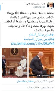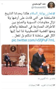 وقال المغرد حمد البوسعيدي: #عمان_بوابة_السلام هكذا يحدثنا التاريخ فالسلطنة هي التي قادت على أرضها ولا تزال مفاوضات التسوية والصلح بين الأطراف المتنازعة في المنطقة والعالم ومنها القضية الفلسطينية لذا لجأ إليها الكل فهي سلطنة لا تتكلم بل تفعل.