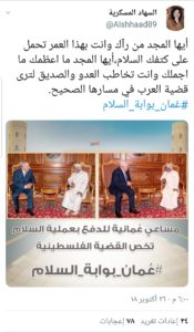 استحوذ إستقبال حضرة صاحب الجلالة السلطان قابوس بن سعيد المعظم – حفظه الله – بنيامين نتنياهو رئيس وزراء إسرائيل يوم أمس الأول في بيت البركة، وقبل ذلك بعدة أيام إستقبال جلالته – دام عزه – للرئيس الفلسطيني محمود عباس على اهتمام المغردين العمانيين، حيث غردوا تحت وسم #عمان_بوابة_السلام عن دور عمان في دعم جهود السلام في الشرق الأوسط ودعمها المتواصل للقضية الفلسطينية.