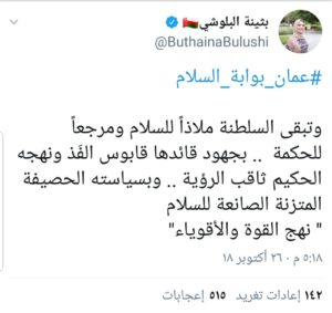 وقالت الإعلامية بثينة البلوشي مغردة: وتبقى السلطنة ملاذاً للسلام ومرجعاً للحكمة.. بجهود قائدها قابوس الفذ ونهجه الحكيم ثاقب الرؤية.. وبسياسته الحصيفة المتزنة الصانعة للسلام ” نهج القوة والأقوياء “.