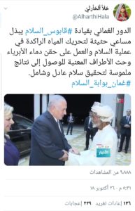 وغردت حلا الحارثي: الدور العماني بقيادة قابوس السلام يبذل مساعي حثيثة لتحريك المياة الراكدة في عملية السلام والعمل على حقن دماء الأبرياء وحث الاطراف المعنية للوصول إلى نتائج ملموسة لتحقيق سلام عادل وشامل.