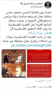 وغرد الشيخ إسحاق بن سالم السيابي قائلاً: عندما يزور فخامة الرئيس محمود عباس سلطنة عمان، ثم يتبعه مباشرة دولة بنيامين نتنياهو، فعلى الجميع أن يصمت لينتظر النتائج الطيبة لحل القضية الفلسطينية بما يعيد كافة الحقوق الفلسطينية لأن #عمان_بلد_السلام ، بعد أن عانت القضية الفلسطينية سنوات من تدخلات وطرح حلول مختلفة غير عادلة.