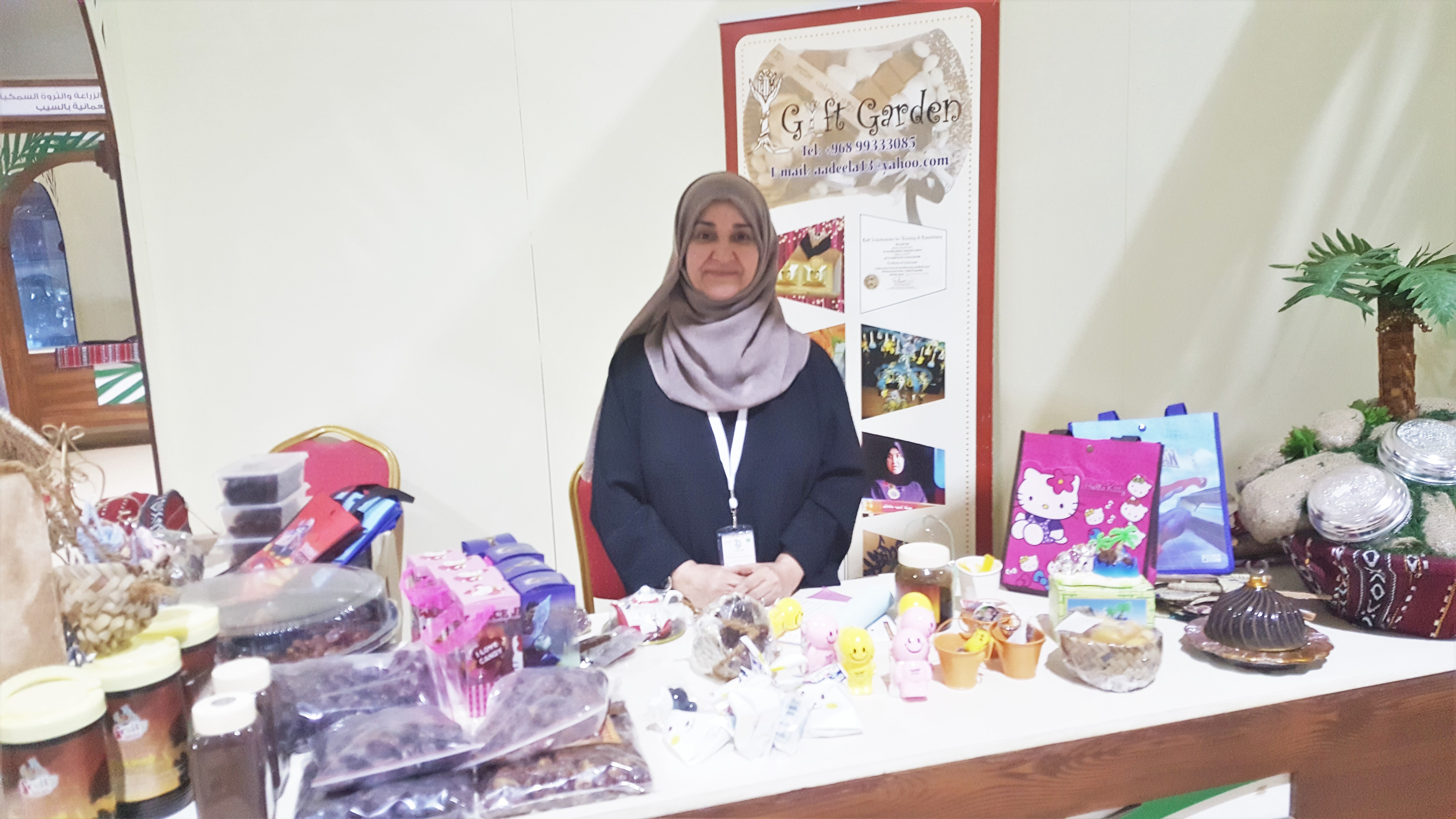تشارك المرأة العمانية في مهرجان التمور العمانية السادس، ايمانا منها بأهمية العمل في المؤسسات الصغيرة والمتوسطة ومساهمتها في تطوير الصناعات القائمة على التمور، وهي تبدع في ذلك من خلال التمور المعروضة بأشكال واحجام متنوعة.