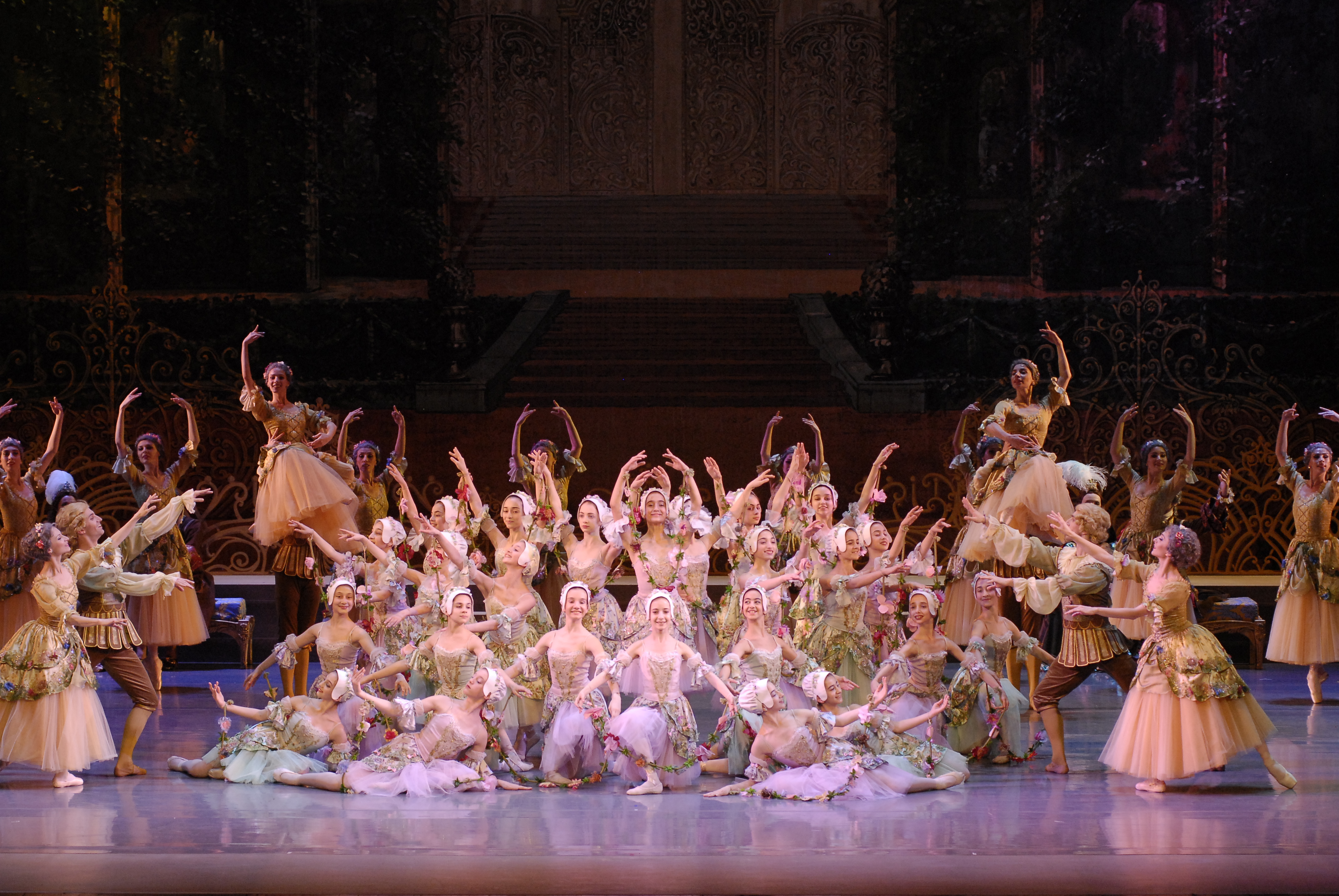 وتدور أحداث هذا العرض المبهر حول الأميرة الجميلة التي تمنّت لها الجنيات السبع حين شاهدنها عندما كانت طفلة أمنيات جميلة فالأولى تمنّت أن تكون أجمل فتاة في العالم أما الثانية فتمنّت لها أن تملك عقل ملاك والثالثة أن تصبح رشيقة القوام والرابعة أن تكون راقصة والخامسة أن تغنّي بصوت جميل والسادسة أن تعزف على كلّ الآلات الموسيقية لكن عندما بدأت الجنية السابعة تفكّر بأمنية مناسبة للأميرة الصغيرة دخلت جنّيّة عجوز إلى القاعة وهي في حالة غضب شديد بسبب عدم دعوتها للحفل، وتنبّأت بموت الأميرة من جراء وخزة بإصبعها من آلة الغزل عندما يصل عمرها الى السادسة عشرة ثم اختفت العجوز الشريرة بعد أن تركت الجميع يبكون .