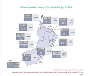 وبلغ عدد الشباب في الفئة العمرية من أقل من 20 سنة إلى 30 سنة المؤمن عليهم النشطين في نظام العاملين لحسابهم الخاص ومن في حكمهم الفين و773 شابا وشابة في عام 2017 مشكلين ما نسبته 28.3% من بقية الفئات كذلك فإن 74% من إجمالي الباحثين عن عمل في السلطنة هم شباب من سن 15 إلى 29 سنة.