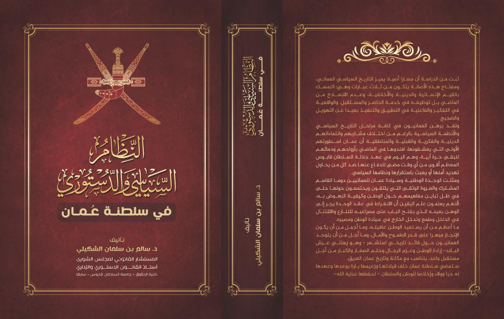 ويتناول كتاب “النظام السياسي والدستوري في سلطنة عمان”، للدكتور الشكيلي النظام السياسي والدستوري في السلطنة في إطاره التاريخي والحالي وهو ينقسم إلى قسمين؛ الأول يتعاطى مع النظام السياسي في الإطار التاريخي ويبدأ بباب تمهيدي حول التعريف بسلطنة عمان من حيث الموقع وأهميته السياسية والاقتصادية، ثم تتوالى أبواب القسم الأول ، فالباوب الأول يُعنى بعمان في العصر العصر الاول بداية من عصر النبوة والخلافة الراشدة ، ثم يأتي الباب الثاني من هذا القسم ليرسم الصورة السياسية المتعاقبة في عهد اليعاربة وما سطره هذا العهد في التاريخ السياسي العماني من إسهامات في بناء الدولة وتوحيدها تحت مظلة السلطة الواحدة ، بدءًا من الإمام ناصر بن مرشد اليعربي ، مرورًا بأبرز أئمة اليعاربة سلطان بن سيف وبلعرب بن سلطان وسيف بن سلطان قيد الأرض وسلطان بن سيف بن سلطان إلى أن نصل مرحلة الحرب الأهلية وسقوط دولة اليعاربة. ويختتم القسم الأول بالباب الثالث المخصص لعهد دولة البوسعيد بدءًا من حكم الإمام أحمد بن سعيد البوسعيدي وحتى يوم الثاني والعشرين من يوليو عام 1970 م .
