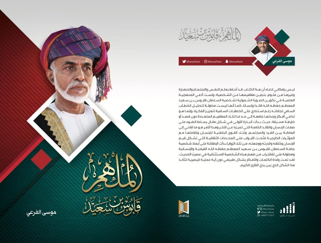 أما الكتاب الثاني “المهلم.. قابوس بن سعيد” للفرعي فيأتي “تحفيزا لمن هم أكثر معرفة بمناهج البحث الحديث وأدواته في دراسة شخصية فذة واستثنائية كجلالة السلطان قابوس بن سعيد المعظم حفظه الله ورعاه، بكل أبعاده المعرفية والأخلاقية ليتمكنوا من ملامسة المناطق الإنسانية التي مكّنته من اجتماع القلوب على حبه والعقول على حكمته وقيادته جاعلة منه الشخصية الأكثر تأثيرًا في العالم سواء في الداخل أو في الخارج“.