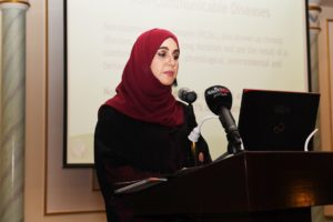 ثم تتطرقت في الجزء الثاني من عرضها الى اهم مؤشرات عوامل الخطورة التى من شأنها ان توثر على صحة الانسان و تنقسم الى عوامل سلوكية قابلة للتغير و هى الغذاء غير الصحي، قلة ممارسة النشاط البدني والرياضة، تعاطي التبغ والتدخين و اخيرا تعاطي الكحول و عوامل بيولوجية مثل زيادة الوزن و السمنة، إرتفاع ضغط الدم، أرتفاع السكر فى الدم و أرتفاع الدهون في الدم (أرتفاع الكولسترول).