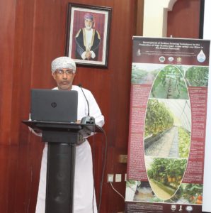 وقد القى الدكتور حمود بن درويش الحسني مدير عام البحوث الزراعية والحيوانية كلمة قال فيها : لقد بدأ التنوع في زراعة محاصيل الخضر في السلطنة عبر إدخال وتقييم العديد من أنواع وأصناف الخضر ذات الإنتاجية العالية ونشر زراعتها لدى المزارعين ، الأمر الذي ساهم في زيادة انتاجية تلك المحاصيل ، حيث تشير احصائيات الوزارة لعام 2017 إلى أن اجمالي المساحة المزروعة بمختلف أنواع محاصيل الخضر بلغت أكثر من (40) ألف فدان وبإجمالي انتاج وصل إلى حوالي (410) آلاف طن. أما فيما يتعلق بالنخيل، فإنه يحظى بأهمية كبيرة على المستوى المحلي لكونه يمثل المحصول الأول في السلطنة ويعتبر ركيزة من ركائز الاقتصاد الوطني ودعامة هامة للأمن الغذائي، ناهيك عن انسجام النخيل والتمور ومنتجاتهما في نسيج المجتمع العماني وما تمثله من موروث حضاري مرتبط بالأجيال المتعاقبة من العمانيين مشكلةً منظومة بيئية متفردة للإنسان العماني ومكونات بيئته. وما الاهتمام السامي من لدن حضرة صاحب الجلالة السلطان قابوس بن سعيد المعظم – حفظه الله ورعاه – بالنخيل حينما وجه جلالته بتنفيذ مشروع زراعة المليون نخلة إلا دليلاً واضحاً على مكانة النخلة في قلوب العمانيين. ويمثل النخيل أهمية خاصة في الانتاج الزراعي في السلطنة من حيث المساحة وعدد الأشجار المنتشرة في ربوع السلطنة ، حيث يبلغ عدد أشجار النخيل في الحيازات الزراعية أكثر من 7,5 مليون نخلة حسب نتائج التعداد الزراعي لعام 2013 إضافة إلى ما يقارب من مليون نخلة في الحدائق المنزلية والمتنزهات والشوارع والأماكن العامة الأخرى حيث تبلغ مساحة الحيازات الزراعية للنخيل (355) ألف فدان منتجة ما يزيد عن (361) ألف طن من التمور حسب تقديرات الوزارة للموسم الماضي لعام 2017م.
