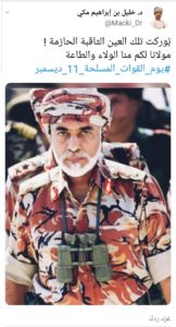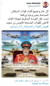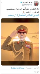 وأما المغرد أنس البلوشي فقد هنأ القوات المسلحة قائلاً : كل عام وجميع أفراد قوات السلطان المسلحة بخير وعزة ورفعة تحت ظل القيادة الحكيمة لمولانا القائد الأعلى لقوات السلطان المسلحة قابوس بن سعيد.