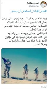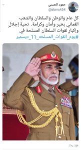 وغرد حمود الحسني: كل عام والوطن والسلطان والشعب العماني بخير وأمان وكرامة. تحية إجلال وإكبار لقوات السلطان المسلحة .