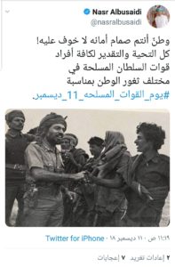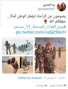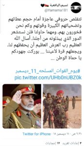 تحتفل السلطنة اليوم بيوم القوات المسلحة المجيد، ذكرى الحادي عشر من ديسمبر، وقد احتفل المغردون في السلطنة بهذه المناسبة المجيدة عبر إطلاق وسم #يوم_القوات_المسلحة_11_ديسمبر وعبروا فيه عن سعادتهم بالإنجازات التي حققتها قوات السلطان المسلحة في مختلف الجوانب التنظيمية والتدريبية والتسليحية، في ظل الرعاية الكريمة التي تحظى بها من لدن حضرة صاحب الجلالة السلطان قابوس بن سعيد المعظم القائد الأعلى للقوات المسلحة – حفظه الله ورعاه-.