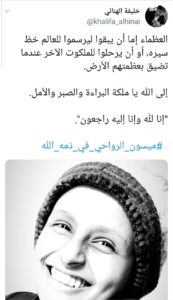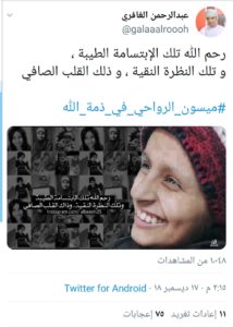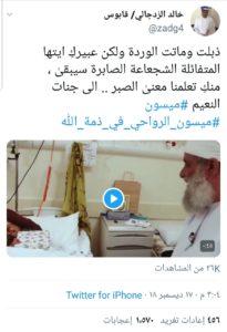 وغرد الإعلامي خالد الزدجالي: ذبلت وماتت الوردة ولكن عبيركِ أيتها المتفائلة الشجاعة الصابرة سيبقى، منكِ تعلمنا معنى الصبر. إلى جنات النعيم.