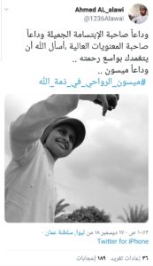 وأما المغرد أحمد العلوي فقد غرد: وداعاً صاحبة الإبتسامة الجميلة، وداعاً صاحبة المعنويات العالية، أسأل الله أن يتغمدك بواسع رحمته.. وداعاً ميسون.